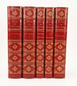 BERANGER. OEUVRES DIVERSES. - CHANSONS, Paris, Perrotin, 1859. 2 volumes - MUSIQUE DES CHANSONS. P., Perrotin, 1858. 1 vol. - DERNIERES CHANSONS. P., Perrotin, 1857. 1 vol. - MA BIOGRAPHIE. P., Perrotin, 1857. 5 volumes in-8, demi maroquin rouge à coins, dos à nerfs très orné, t. dorée (A. Raparlier).