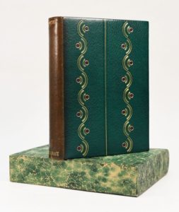 BOREL (Petrus). CONTES IMMORAUX. Champavert. Illustrations en couleurs de Jean Gradassi. P, Editions de l'Odéon, (1951). Grand in-8, maroquin vert émeraude, plats ornés de 2 guirlandes dorées formées de courbes et entrecoupées de pièces rondes de maroquin brun, dos lisse, t. dorée, couvertures et dos conservés, étui bordé (Devauchelle).
