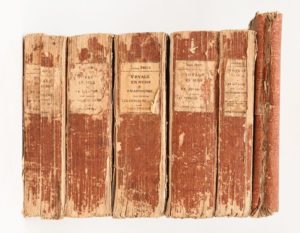 Première édition de la traduction française par Castéra, très recherchée selon Chadenat. Explorateur et géographe écossais, James Bruce entreprit en qualité de consul d'Alger un voyage en Afrique septentrionale, à la recherche des sources du Nil. Son voyage est illustré de 88 PLANCHES (dont 4 grandes cartes dépliantes), montrant des vues, des scènes de genre, de botanique, d'antiquités et d'histoire naturelle, d'écriture...etc. Le cinquième volume contient une relation de William Paterson intitulée Quatre voyages dans le pays des Hottentots et la Cafrerie en 1777, 1778, 1779. Dos fendus, les marges sont poussiéreuses surtout sur les planches, l'intérieur est frais et les volumes, tels que parus, ont conservés leurs marges d'origine, petite galerie marginale sur quelques feuillets du second tome. (Chadenat, 1062).