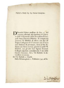 GINARO Carlo, Lettera a firma di Carlo Ginori per l’ammissione all'Accademia Etrusca di cui diventerà Lucumone nel 1756. — Datata 4 febbraio 1755.