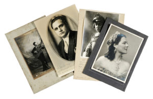 STRAORDINARIA RACCOLTA di 57 fotografie - e alcune fotocartoline - con dediche e firme autografe, insieme a cartoline viaggiate e biglietti di cantanti lirici e musicisti. Inizio XX secolo.