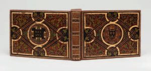 [Reliure Du xvie Siècle]. In-8, veau Lavallière, les plats entièrement couverts d’un décor formé de listels à la cire crème ou noire formant des compartiments avec filets dorés et multiples feuilles à la cire verte, armoiries au centre du