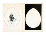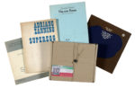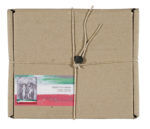 Cofanetto di catalogo (cm 17,5x21x3,5) in pieno cartonato rustico legato da spago con sigillo metallico contenente : 14 cartoncini con le opere esposte nella mostra, 1 cartoncino realizzato dall'Artista in occasione della stessa, 3 pieghevoli, 1 cartoncino riassuntivo.