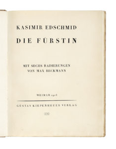 Kasimir EDSCHMID, Die Fürstin. — Mit 6 Radierungen von Max Beckmann. — Weimar: Gustav Kiepenheuer, 1918. — In-4° grande (mm 295x230).