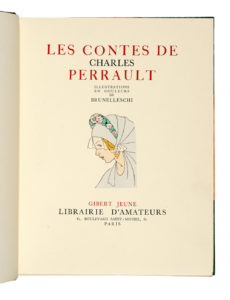 PERRAULT Charles, Les contes [...] illustrations en couleurs de Brunelleschi. — Paris: Gibert Jeune, Librairie d'Amateurs, [1946]. — In-4° (mm 260x195).