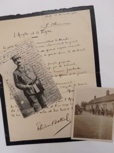 BOTREL Théodore (1868-1925) Poème autographe signé à Georges Clemenceau, intitulé L'Aigle et le Tigre ; photographie carte postale autographe signée, Metz, 22 novembre 1918. 2 pp. in-folio sur papier de deuil et in-12. Ainsi qu'une photographie d'époque de Georges Clemenceau, visitant le front, à Montdidier, le 9 juin [1918]. Présence de trous faits par une perforeuse sur le poème et la carte (hors texte).