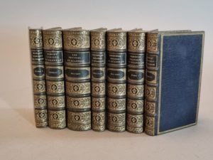 SCARRON. Œuvres. Suivant la Copie imprimée à Paris, 1668. Ensemble 11 parties en 7 volumes petit in-12, maroquin bleu, triple filet doré, dos orné, dentelle intérieure, tranches dorées sur marbrure (Thibaron).