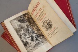 TERENCE. Les Comédies, avec la traduction et les remarques de Madame Dacier. Rotterdam, Aux dépens de Gaspar Fritsch, 1717. 3 volumes in-12, maroquin rouge à long grain, encadrement de filets dorés et à froid, dentelle à froid, fleuron à froid au centre, dos orné, dentelle intérieure, tranches dorées (Reliure anglaise de la fin du XVIIIe siècle).