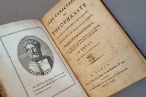 Elle est ornée en frontispice du portrait en buste de Théophraste, philosophe grec (371-288 av. J.-C.), élève d'Aristote qui le désigna pour son successeur à l'école Péripatéticienne. Il fut le premier scholarque du Lycée.