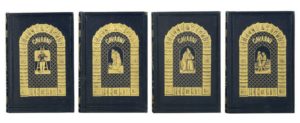 GAVARNI. Œuvres choisies. Paris, Hetzel, 1846-1848. 4 volumes in-8, cartonnage percaline bleu nuit, grande plaque dorée sur les premiers plats ornée dans un même encadrement d'une composition différente pour chaque volume, dos ornés de fers spéciaux, tranches dorées (Reliure de l'éditeur).