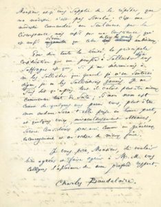 Précieuse lettre de candidature de Baudelaire à l'Académie française, dans laquelle il commente ses œuvres. [En 1861, deux fauteuils devinrent vacants après la mort de Scribe et de Lacordaire. Baudelaire présenta sa candidature, et effectua une visite chez Alfred de Vigny, lequel tenta d'abord de le dissuader avant d'accepter de soutenir ce qu'il comprit être une ferme intention. Plus tard, Baudelaire retirera sa candidature.] « J'ai l'honneur de vous instruire que je désire être inscrit parmi les candidats qui se présentent pour l'un des fauteuils actuellement vacants à l'Académie française, et je vous prie de vouloir faire part à vos collègues de mes intentions à cet égard. Il est possible qu'à des yeux trop indulgents je puisse montrer quelques titres : permettez-moi de vous rappeler un livre de poësie qui a fait plus de bruit qu'il ne voulait [Les Fleurs du mal] ; une traduction qui a popularisé en France un grand auteur inconnu [Edgar Allan POE] ; une étude sévère et minutieuse sur les jouissances et les dangers contenus dans les Excitants [Les Paradis artificiels] ; enfin un grand nombre de brochures et d'articles sur les principaux artistes et les hommes de lettres de mon temps. Mais à mes propres yeux, Monsieur, c'est là un compte de titres bien insuffisant, surtout si je les compare à tous ceux, plus nombreux et plus singuliers, que j'avais rêvés. Croyez donc, Monsieur, et je vous supplie de le répéter, que ma modestie n'est pas simulée ; c'est une modestie commandée, non seulement par la circonstance, mais aussi par ma conscience, qui est aussi sévère que celle de tous les grands ambitieux. Pour dire toute la vérité, la principale considération qui me pousse à solliciter déjà vos suffrages est que, si je me déterminais à ne les solliciter que quand je m'en sentirai digne, je ne les solliciterais jamais. Je me suis dit qu'après tout il valait peut-être mieux commencer tout de suite ; si mon nom est connu de quelques-uns parmi vous, peut-être mon audace sera-t-elle prise en bonne part, et quelques voix, miraculeusement obtenues, seront considérées par moi comme un généreux encouragement et un ordre de mieux faire »...