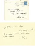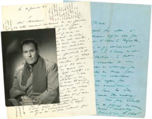 [Marianne OSWALD (1901-1985), chanteuse et actrice, amie des poètes, était une remarquable diseuse ; elle collabora à ses émissions radiophoniques ou télévisées consacrées à la poésie.] 11 janvier 1950. Il se réjouit des succès de Marianne en Allemagne. En prévision d'une émission radiophonique, il donne quelques éléments biographiques : « je suis né en 1907 à L'Isle-sur-Sorgue, Vaucluse. Je me sui bien emmerdé jusqu'à 20 ans, beaucoup mal présenté au monde sous l'aspect d'un élève de Lycée révolté et souvent puni. Puis j'ai “gagné” ma vie en vendant de la chicorée et du wisky à Marseille (j'avais 18 ans !), j'ai traversé la Méditerranée et vécu en Tunisie. Revenu, je me suis occupé de la terre que j'aime bien et de matériaux de construction que j'aime moins. Voilà pour l'estomac. Sous les nazis, le maquis, puis à l'État-major Interallié à Alger enfin le débarquement. J'ai tué quelques salauds par nécessité militaire et civique en 1940-44. Je ne m'en vante pas, il y a trop de survivants qui les prolongent et les surpassent en saloperie. À présent je suis contre la peine de mort qui n'arrange rien »...