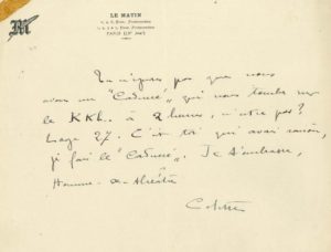 On joint une L.S. « Colette de Jouvenel », 19 juin 1919, à Tristan Bernard, à qui elle demande un portrait de lui pour accompagner la publication de son conte dans Le Matin (1 p. in-8).