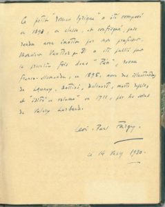 Sur le feuillet de garde du présent manuscrit, Léon- Paul Fargue a lui- même retracé la genèse son livre, dans une note autographe signée datée du 14 mars 1930 : « Ce petit “roman lyrique” a été composé en 1893, en classe, et confisqué, puis rendu avec émotion par mon professeur, Monsieur Vautier. Il a été publié pour la première fois dans Pan, revue franco-allemande, en 1895, avec des illustrations de Launay, Bottini, Delcourt, morts depuis, et “édité en volume” en 1911, par les soins de Valery Larbaud ».