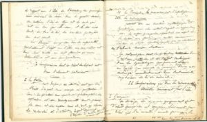 FLAUBERT Gustave (1821-1880). 2 MANUSCRITS autographes, Hegel Cours d'esthétique, [1844 et 1872] ; 51 pages sur 48 ff. de papier vélin fin, puis 13 pages sur 7 ff. de papier bleu (mal chiffrées 1-52, puis 53-59), environ 22,5 x 18,5 cm, le tout monté sur onglets et relié en un volume petit in-4, cartonnage ancien papier gaufré vert.