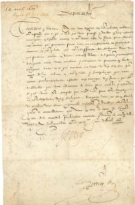 Lettre accompagnant l'envoi de lettres patentes « pour adviser aux moiens qui pourroient servir tant au parachevement du Pont neuf commencé en nostre ville que restablissement des fontaynes d'eaue vive qui souloient sortir en divers endroits dicelle, a lexpedition & accomplissement de laquelle nous vous mandons & ordonnons de pourveoir en toutte dilligence tant en ce qui concerne la levee de dix sols sur chacun muyd de vin entrant en nostre ville & fauxbourgs que nous avons partculierement affectee aux ouvrages dudit Pont, que pour lassemblee que vous ordonnons de faire pour arrester & resouldre ce qui vous est propose par nosd. Lettres pour estre employe au restablissement desd. Fontaynes »...