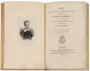 HUGO Victor (1802-1885). Ode sur la naissance de Son Altesse Royale Monseigneur le duc de Bordeaux, suivie d'une Ode sur la mort de Son Altesse Royale Monseigneur le duc de Berri (Paris, Boucher, Pélicier et Ponthieu, 1820) ; in-8, maroquin crème, dos à nerfs, encadrement intérieur de fleurs de lys dorées et d'un listel de maroquin bleu, doublures et gardes de soie beige, tranches dorées (Marius Michel).