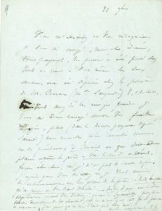 « Vous m'étonnez et vous m'inquiétez. Je vous ai envoyé, mon cher éditeur, trois paquets, le premier a été porté chez vous et remis à vous-même. Les deux autres ont été déposés chez la portière de M. Bertin [...] où vous avez dû les envoyer prendre. Je vous ai donc renvoyé toutes vos feuilles corrigées, plus (dans le dernier paquet déposé samedi) une nouvelle pièce intitulée comme une des précédentes à Canaris et qui doit être placée après la pièce à M. le duc d'Orléans. Faites chercher car je n'ai pas de seconde copie. J'espère que vous trouverez et je vous envoie le commencement et le plan de la pièce : ô Rois le pain qu'on porte au vieillard desséché [Conseil] - Notre-Dame est à votre disposition quand vous voudrez. Quant à Cromwell, priez ma tante Martine de le chercher, car ce n'est pas ici qu'il peut se trouver. J'ai peur qu'on ne l'ait pris chez moi »...
