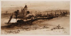 Un château-fort médiéval, au bord d'un lac ou d'un fleuve sur lequel est un bateau à voiles ; au premier plan, une rangée d'arbres descend vers l'étendue d'eau, au bord de laquelle on devine quelques chaumières. Une partie de l'étendue d'eau est laissée en réserve, créant un bel effet de lumière. Les paysages de Victor Hugo sont parfois topographiques, mais ils relèvent souvent de la fantaisie. Il semble que ce paysage relève de l'imaginaire, plus que d'un souvenir de voyage. Le dessin est à rapprocher de ceux faits sur ses carnets, lors du voyage sur le Rhin, dont le récit, Le Rhin, fut publié en cette année 1842.