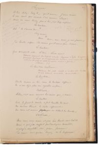 Il a également noté au crayon un certain nombre de remarques sur une paperolle (35,5 x 7 cm, recto-verso), soit 80 lignes, acte par acte : « I dire le lieu dès que poss - exposer la Cour d'amour. Scène iii inutile à l'action. Pendant 2 scènes Suzanne de dit rien »... Etc.