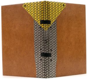 Charles maurras (1868-1952). Inscriptions (Paris, Librairie de France, F. Sant'Andrea, L.Marcerou & Cie, 1922) ; in-12, reliure à nerfs apparents, composée de deux pièces de cuir à motifs imprimés de faux tressé, l'une jaune sur le haut du dos disposée en pointe débordant sur les plats, l'autre grise couvrant le reste du dos et une petite partie des plats ; plats de médium verni satiné brun, petits cabochons noir ; doublures de nubuck jaune, couverture illustrée et dos conservés, chemise à dos de box gris doublé de nubuck jaune, étui (J. de Gonet, 2006).
