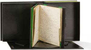 SARTRE Jean-Paul (1905-1980). MANUSCRIT autographe, [Carnet Midy, 1924] ; 47 pages in-12 (153 x 115 mm) sur 44 ff. (plus 41 pages blanches) en un carnet à onglets alphabétiques verts, placé sous une reliure veau noir glacé à bandes, plats bifaces dans lesquels sont incrustées deux étroites plaques verticales de verre acrylique jaune fluorescent laissant voir le manuscrit par transparence, dos lisse muet ; le carnet est placé entre deux feuillets neutres transparents et monté sur un onglet de veau glacé noir fixé au dos par une articulation souple de même cuir ; un socle séparateur adapté au volume et recouvert de veau noir glacé est joint, ainsi que le mode d'emploi de ce socle, imprimé sur un feuillet cartonné doublé de même peau ; le tout est placé dans un emboîtage veau noir glacé sur les plats, tranches supérieures et inférieures couvertes de papier jaune fluorescent, titre et nom de l'auteur dorés au film blanc et vert métallisé sur le dos orné de 2 fines baguettes de verre fluorescent (reliure signée de Véronique Sala-Vidal, 2005).