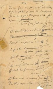 Brouillon de travail, avec ratures et corrections, d'un poème d'amour écrit pour sa maîtresse Eugénie KRANTZ et recueilli dans Invectives (Vanier, 1896), présentant onze variantes ou corrections.