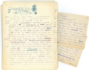 Le manuscrit, complet, est écrit à l'encre violette sur des feuillets perforés de classeur à papier quadrillé : 47 feuillets de format in-4, dont les derniers sont également écrits tête-bêche au verso (p. 40-55), la suite (p. 55-81) au verso de feuillets in-8 à en-tête du Conseil municipal de Paris. Il présente de nombreuses ratures et corrections au fil de la plume, puis d'autres corrections au stylo bleu ou rouge. Le titre du manuscrit est joliment calligraphié et orné à l'encre bleue.