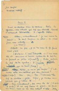 Projet de pièce dans les coulisses d'un studio d'enregistrement de synchronisation de film. Le manuscrit, à l'encre bleue, présente des ratures et corrections.