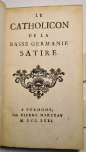 [CORTE (Blaise-Henri de)]. — Le catholicon de la Basse Germanie. — Satire. — A Cologne, chez P. Marteau, 1731. — In-8, [4] f., 237 p., basane havane époque, dos à 5 nerfs, pièce de titre grenat, caissons ornés, tranches rouges, (accroc à...