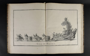 Bel ouvrage entièrement gravé sur cuivre, qui se compose d'un feuillet de titre à encadrement illustré, gravé d'après François Blondel, un feuillet de frontispice allégorique gravé par Flipart d'après Slodtz, 12 pages de texte dans des encadrements ornementaux différents gravés par Tardieu d'après Le Lorrain, 5 planches doubles montrant des chars, gravées par Le Mire, Marvye, et Tardieu, et 2 planches doubles par Benoist et Damun montrant la Place Louis-Le-Grand et le feu d'artifice. Bordure de papier azuré ajoutée au dos de 3 pl.