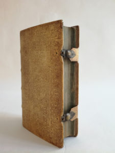 2 ouvrages en un volume in-8, 140 p., [2] f (index) ; [1] f., 382 p., [21] f., peau de truie sur ais de bois de l'époque, dos à 4 nerfs bordés de filets à froid, plats ornés à froid d'encadrements de filets et roulettes avec médaillon central, fermoirs de laiton, tranches azurées (un coin émoussé, tache au dos, mq. au coin de la garde sup., bruniss. ordinaires sans gravité).
