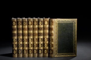 dorés, roulette dorée aux coupes coupe et chasses, tranches dorés (dos uniformément passés bruns, petits trav. de vers au bord de 4 contreplats, et aux coupes de 2 vol., sans gravité ; rousseurs au t.2, très rares par ailleurs).