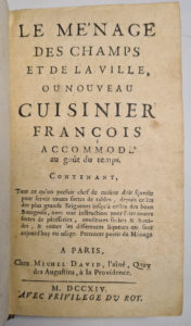 [Gastronomie]. — [LIGER (Louis)]. — Le ménage des champs et de la ville, ou Nouveau cuisinier françois, accomodé au goût du temps... — A Paris, chez M. David l'ainé, 1714. — In-12, [4] f., 584 p., [9 (sur 11)] f., veau havane de...