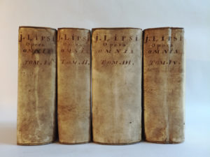 LIPSE (Juste). — Opera omnia, postremum ab ipso aucta et recensita, nunc primum copioso rerum indice illustrata. — Vesaliae : apud A. ab Hoogenhuysen et societatem, 1675. — 4 forts volumes in-8, velin ivoire de l'époque, dos lisse, titre à...