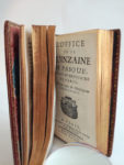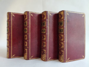 vert foncé, caissons ornés, triple filet et fleurons angulaires dorés aux plats, filet doré aux coupes, roulette intérieure, tranches dorées (un coin émoussé).