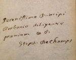 - Louis-Henri, duc de Bourbon (1692-1740), qui dirigea le Conseil de Régence durant la minorité de Louis XV, puis devint Premier ministre. D'après une note jointe, ce livre lui fut offert en prix par son précepteur, le père Étienne Dechamps, jésuite. L'on peut lire sur le premier feuillet de garde l'ex-dono autographe signé du maître : « Serenissimo Principi Borbonio diligentia praemium, Steph. Dechamps ».