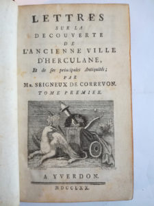 SEIGNEUX DE CORREVON (Gabriel). — Lettres sur la découverte de l'ancienne ville d'Herculane, et de ses principales antiquités. — À Yverdon, s.n., 1770. 2 vol. in-12, X-367 p. + [1] f., 384 p., pl., veau havane époque, dos à nerfs (rel. très...