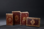 doré, avec fleurs de lys aux angles et armes aux plats, tranches dorées (vol. déformé, un coin usé, mors sup. fendu le long de 2 caissons ; rouss. soutenues).