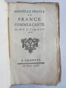 [TIXEDOR (François-Xavier). — Nouvelle France, ou France commerçante, par Mr. F. X. T. — A Londres, s.n., 1765. — In-12, [2] f., VIII-264 p., broché, couv. cartonnée marbrée de l'époque, à toutes marges (dos passé, plat sup. sali, trav...