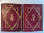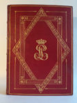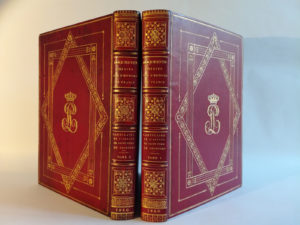 dorés, caissons finement ornés, plats décorés d'un jeu de roulettes et filets dorés, avec monogramme aux centres, roulette dorée aux coupes et bords des contre plats, tranches dorées, garde de satin azur (qq. défauts, dont plat sup. du t.2 défraîchi et mouillure dans les marges de tête de ce même volume).