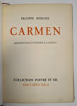 DUBOUT. – MÉRIMÉ (Prosper). — Carmen. — Paris, Kra, 1930. — Petit in-4, demi-chagrin poli brun à coins, dos à 5 nerfs, auteur et titre dorés, tête dorée, couv. et dos conservés [Bernasconi] (frott. superf. aux mors, nerfs et coins).