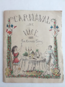 [Nice]. — SÉGUY (Georges). — Carnaval de Nice. — Nice, Imprimerie & lithographie A. Gilletta, 1882. — Grand panorama montrant un défilé, lithographié et colorié, dépliant (24 x 160 cm.), sous couverture illustrée de l'éditeur (saliss....