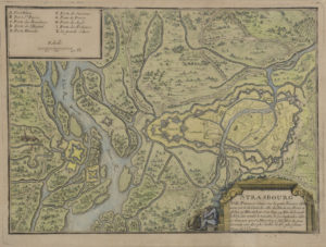 - [Carte]. STRASBOURG, ville fameuse située sur la petite rivière d'Ill Carte gravée sur cuivre, coloriée. Vers 1700. 21 x 28,5 cm. (cuivre), sous marie-louise, verre et cadre moderne (non examinée hors du cadre).