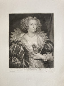 D'après Anton VAN DYCK. — Portrait de Geneviève d'Urfé duchesse de Croi ; Portrait du comte de Nassau ; Portrait de Catherine Howard ; Portrait du Prince de Carignan ; Portrait de Daniel Mytens. — Suite de cinq chalcographies portant un cachet...