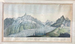 [Alpes] — D'après MÜLLER. — Panorama depuis le Montanvert. — Gravure en couleur, titrée et légendée dans la marge inférieure. — 30 x 50 cm environs — Non examinée hors du cadre.
