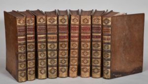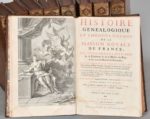 [MIGIEU] - ANSELME Père. HISTOIRE GÉNÉALOGIQUE ET CHRONOLOGIQUE DE LA MAISON ROYALE DE FRANCE, des Pairs, Grands Officiers de la Couronne et de la Maison du Roy & des anciens Barons du Royaume. Avec qualitez, l'origine, le progrès et les armes de leurs familles ; les statuts et le catalogue des Chevaliers Commandeurs et Officiers de l'Ordre du S. Esprit. Le tout dressé sur titres originaux, sur les registres des Chartes du Roy, du Parlement, de la Chambre des Comptes, et du Châtelet de Paris, Cartulaires, Manuscrits de la Bibliothèque du Roy et d'autres cabinets curieux. Par le P. Anselme, Augustin Déchaussé, continué par M. Du Fourny. Troisième édition, revue, corrigée et augmentée par les soins du P. Ange et du P. Simplicien, Augustins Déchaussez. PARIS, FRANÇOIS DIDOT - LA COMPAGNIE DES LIBRAIRES, 1726 - 1733. Neuf volumes, in-folio, pleines reliures de l'époque en veau moucheté. Dos à 6 nerfs cloisonnés et fleuronnés portant les pièces de titre et de tomaison en maroquin rouge, tranches jaspées de rouge. Quelques défauts d'usage (un mors fendu tome II, quelques épidermures, et galeries de vers, quelques feuillets roussis). PREMIÈRE ÉDITION COMPLÈTE.