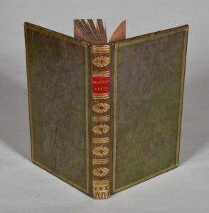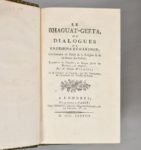 [ WILKINS - PARRAUD]. LE BHAGUAT - GEETA, ou dialogues de Kreeshna et d'Arjoon ; contenant un précis de la religion & de la morale des Indiens. LONDRES & PARIS, BUISSON, 1787. Un volume, in-8, de (1) f., CLXII pp., 180 pp., (2) ff. de catalogue, pleine reliure du XIX en veau glacé bronze. Dos lisse très orné et doré portant une pièce de titre en maroquin rouge, triple filet d'encadrement doré sur les plats, roulette dorée sur les coupes, tranches marbrées, fine frise intérieure dorée. Bel exemplaire. Traduit du Sanscrit, la langue sacrée des Brahmes, en Anglois, par M. Charles Wilkins et de l'Anglois en François, par M. Parraud.