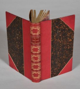 BEAUFORT D'AUBERVAL Alphonse - Aimé. L'ENFANT DU TROU DU SOUFFLEUR ou l'Autre Figaro. J. - J GAY, BRUXELLES, 1883. Deux tomes réunis en un volume, in-8, de (2) ff., III pp., 169 pp. - (1) f. bl., 171 pp.,pleine reliure à coins en chagrin rouge de l'époque. Dos à 5 nerfs cloisonné, fleuronné et doré portant le titre doré, filets dorés sur les plats, tête dorée, couverture conservée. Bel exemplaire. Complet des deux frontispice gravés.