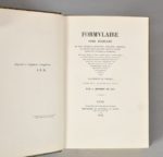 BENOIT DU TRONCY. FORMULAIRE FORT RÉCRÉATIF DE TOUS CONTRACTS, DONATIONS, TESTAMENS, CODICILLES ET AUTRES ACTES QUI SONT FAICTS ET PASSÉS PARDEVANT NOTAIRES ET TESMOINGS, faict par Bredin le Cocu, notaire rural et contre-roolleur des Basses - Marches, au royaume d'Utopie, par lui depuis nagueres reveu et accompagné, pour l'édition de tous bons compagnons, d'un dialogue par lui tiré des oeuvres du philosophe et poëte grec Symonides de l'origine et naturel foemini generis. Nouvelle édition, collationnée sur les anciennes par C. Breghot du Lut. LYON, IMPRIMERIE DE DUMOULIN ET RONET, 1846. Un volume, in-8, de (2) ff., 175 pp., pleine reliure en maroquin vert d'eau. Dos à 5 nerfs cloisonné, fleuronné et doré portant le titre doré, triple filet doré en encadrement des plats, filet doré sur les coupes, dentelle dorée intérieure, tranches dorées. Petits frottements sur les coins. Réimpression à 50 exemplaires seulement, d'un livre fort singulier, paru pour la première fois à Lyon chez P. Rigaud en 1594. D'après Péricaud, la devise "Bonté n'y soit" qui signe l'avis au lecteur serait l'anagramme du nom de l'auteur Benoît Troncy. Contrôleur des Domaines du roi, secrétaire de la ville de Lyon, il traduisit le Traité de La Consolation imprimé en 1584 chez le même libraire P. Rigaud. Il s'est proposé, dit il, de rédiger des modèles de toute espèce de contrat en se conformant au style ordinaire des notaires, et quant au fait du sujet, il a inventé pour son plaisir aux fins d'y accommoder ledit style pour les notaires du Royaume d'Utopie...